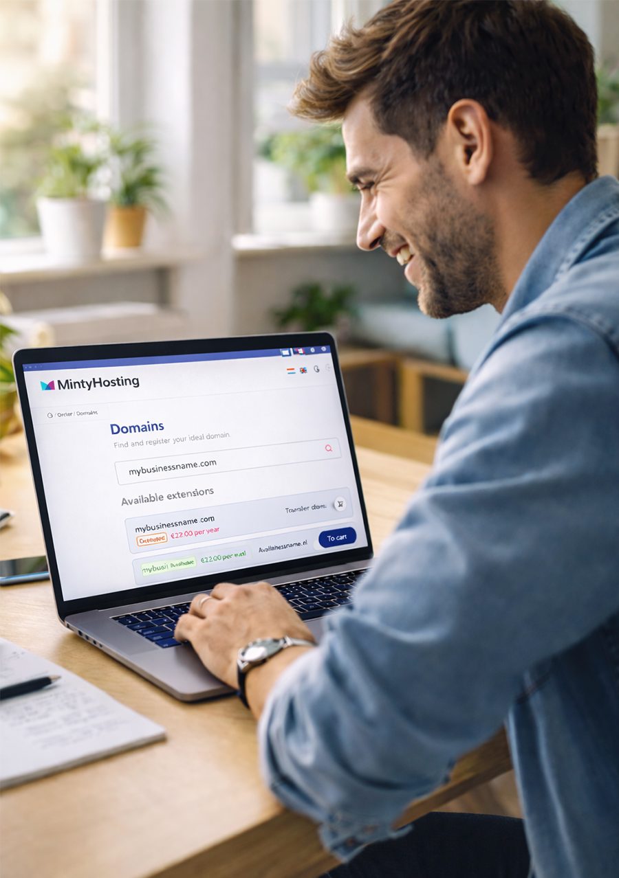 Wil je professioneel e-mailen met zakelijke contacten? Of een website of webshop laten maken? Dan is een eigen domeinnaam onmisbaar. Registreer je domeinnaam bij Minty Hosting en zet vandaag nog de eerste stap online.